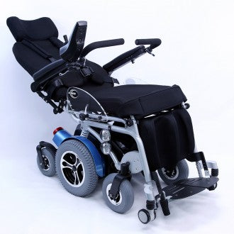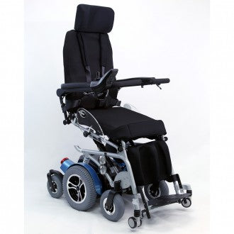 When it comes to standing devices, this chair is at the top of the food chain. It comes standard with a mid wheel drive, full sit to stand power function, power tilting and reclining feature, a full control display, ergonomic leg rest support cushion, extendable arm support, full support harness, and a new power hydraulic system