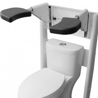 Pants Up Easy Wall Frame Model is engineered to be placed behind the toilet, and marries up with the same Wall Mount system to work in the exact same way. The difference is the Wall Frame Model does not need to be installed by a licensed contractor.