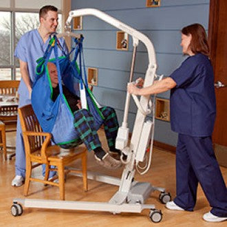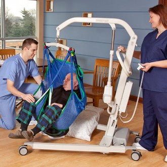 The aluminum frame is made to offer the highest in weight bearing capability for a midsize lift, yet is lightweight and easy to maneuver. The unique quick release design for the carry bar allows for new and old style bars to be used. The lifting range allows a client to be lifted from the floor and transferred to a high bed and the base design offers stability and user control when navigating close quarters.