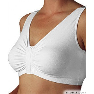 Silvert's Arthritic Front Closing Bra is designed to slip on and off with ease. The bra features three large flat hooks, eliminating the struggle with the smaller hooks on ordinary bras. An Easy Touch tab in front of each hook guides the hook into it's closure, and the large finger loops enable easy grasping to facilitate dressing. Two fingers and the palm of the hand are all you need to close or open this bra. Terrific for those with limited hand dexterity, multiple sclerosis, fibromyalgia, torn rotator cuff and limited upper arm mobility. Soft cotton interlock blend. This bra does not come in cup sizes, but will accommodate an A to D cup size. Terrific for seniors/elderly with arthritis.