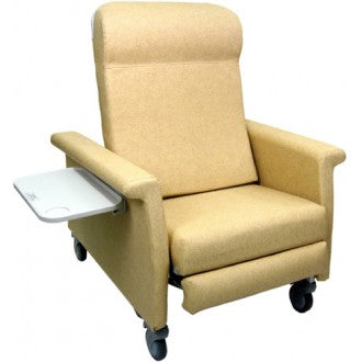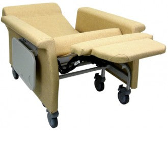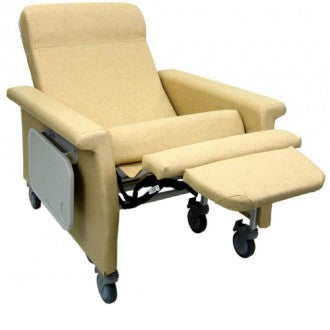 The 691N Elite Bariatric Clinical Recliner is the Extra Large version of our popular 690N CareCliner featuring smooth seamless upholstery that does not collect fluids, is easily cleaned, and an infinitely adjustable back. The leg rest extends automatically and three positions can be attained by the user. The non-porous blow molded fold down side tray with cup recess comes standard on both the right and left sides. Chair features Trendelenburg release with handle accessible from either side. It also has a built-in ergonomic headrest, wide elastic band on the back frame that provides exceptional comfort and an elastic open seat base.